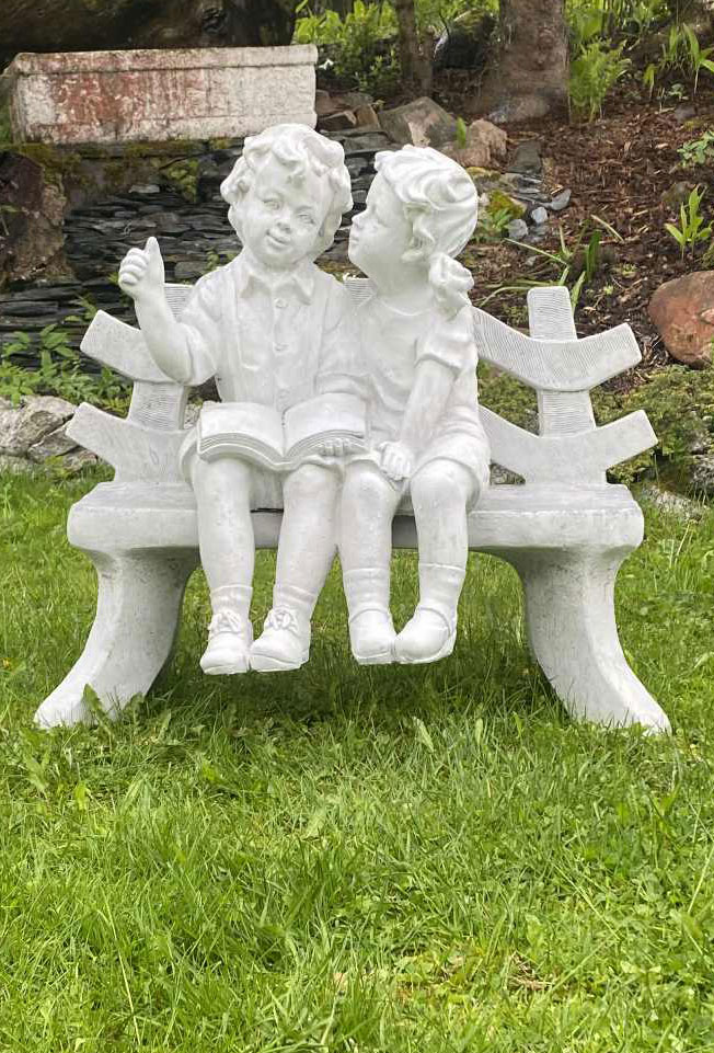 Romantisk skulptur av barn som sitter på en benk. Et vakkert og populært element i hagen. Håndlaget i Norge av solid betong. Tilpasset nordiske forhold og egnet for norske hager og uteområder.