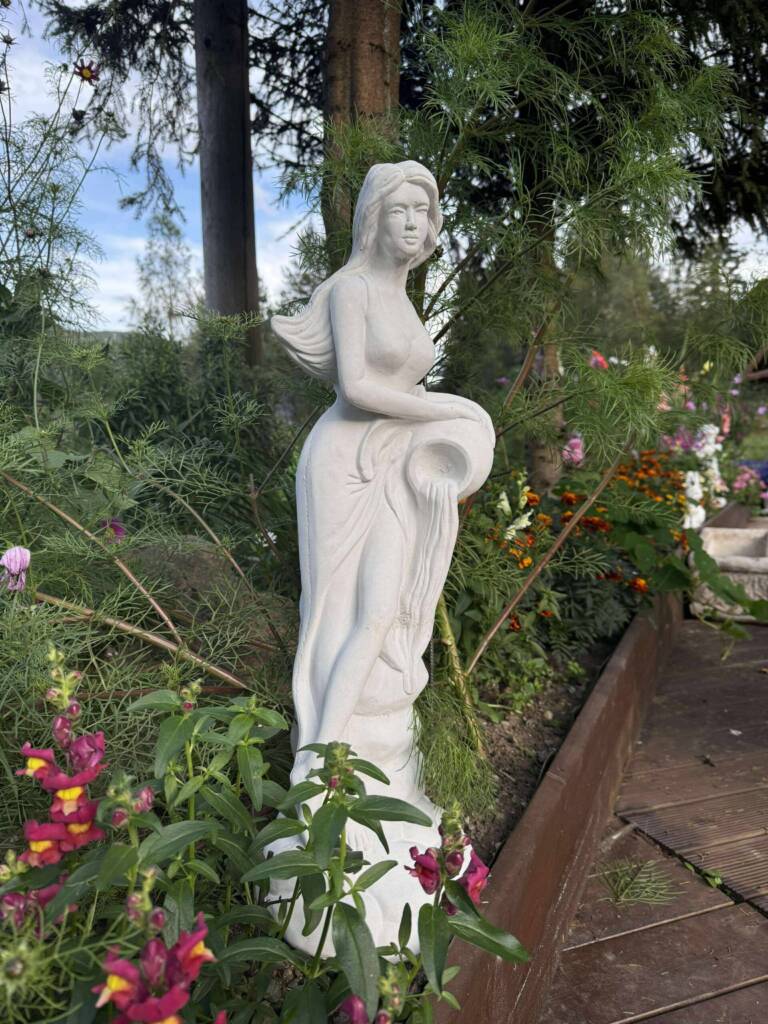Elegant fontene med kvinne og krukke i klassisk stil. Passer som midtpunkt i hagen og gir et harmonisk uttrykk. Håndlaget i Norge av solid betong. Tilpasset nordiske forhold og egnet for norske hager og uteområder.
