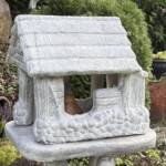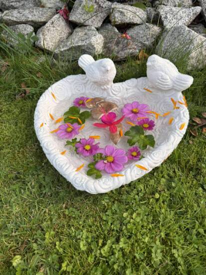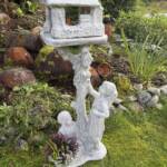 Stor dekorativ fuglemater med detaljerte figurer. Kombinerer funksjon og estetikk i hagen. Håndlaget i Norge av solid betong. Tilpasset nordiske forhold og egnet for norske hager og uteområder.