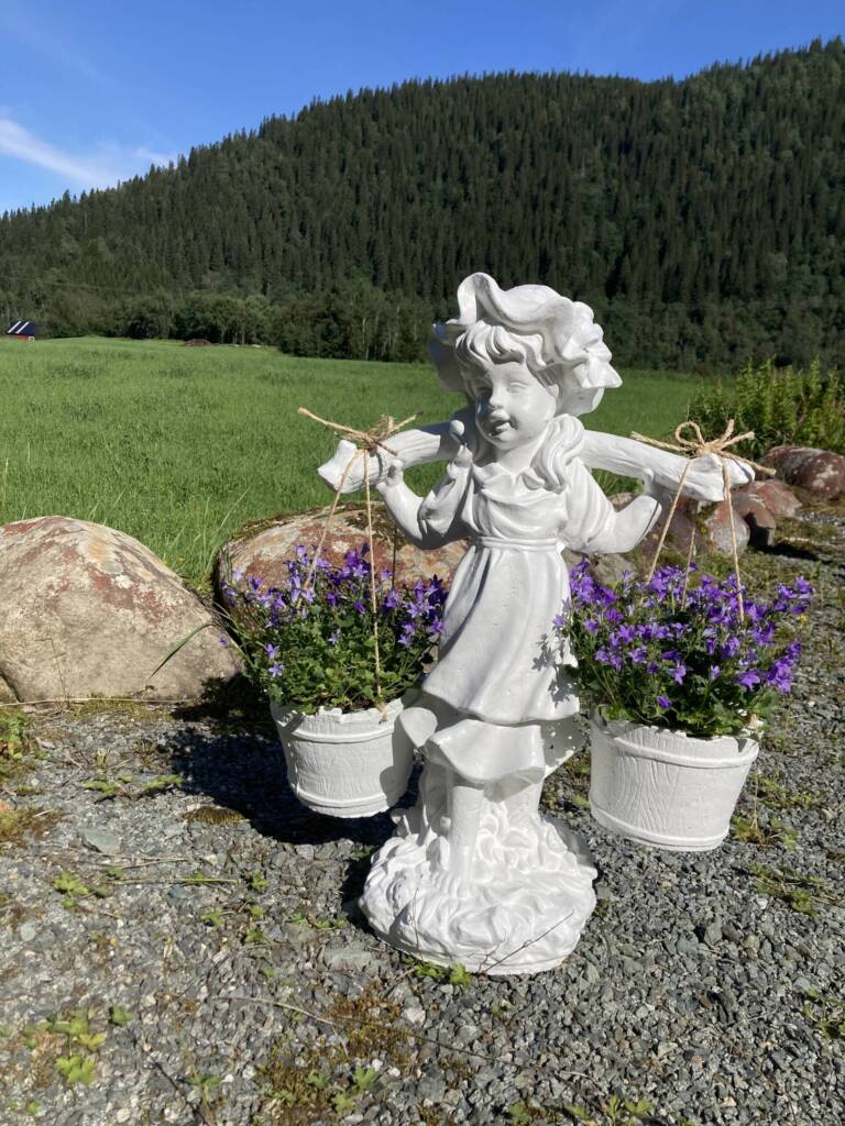 Dekorativ betongskulptur av en jente med blomsterkurver. Perfekt for å kombinere pynt og beplantning i hagen eller ved inngangspartiet. Håndlaget i Norge av solid betong. Tilpasset nordiske forhold og egnet for norske hager og uteområder.