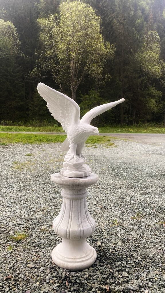 Ørn plassert på en elegant sokkel. Gir et eksklusivt og markant uttrykk i uteområdet. Håndlaget i Norge av solid betong. Tilpasset nordiske forhold og egnet for norske hager og uteområder.